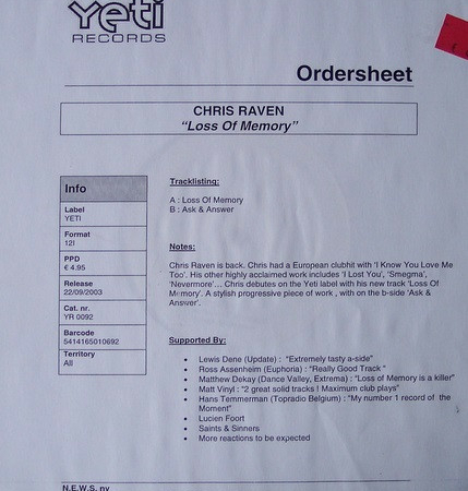 YR 0092 – Chris Raven – Loss Of Memory – (12″, Promo, W/Lbl)