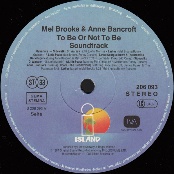 Soundtrack to Alan Johnson’s movie ”To Be Or Not To Be” starring Mel Brooks, Anne Brancroft, Tim Matheson, Charles Durning, Jose Ferrer, George Gaynes, Christopher Lloys, George Wyner, Lewis J. Stadlen and Jack Riley. Music by John Morris, Production and Design by Terence Marsh, Director of Photography Gerald Hirschfeld, Associate Producer Irene Walzer, Screenplay by Thomas Meehan & Ronny Graham, Executive Producer Howard Jeffrey. Produced by Mel Brooks.