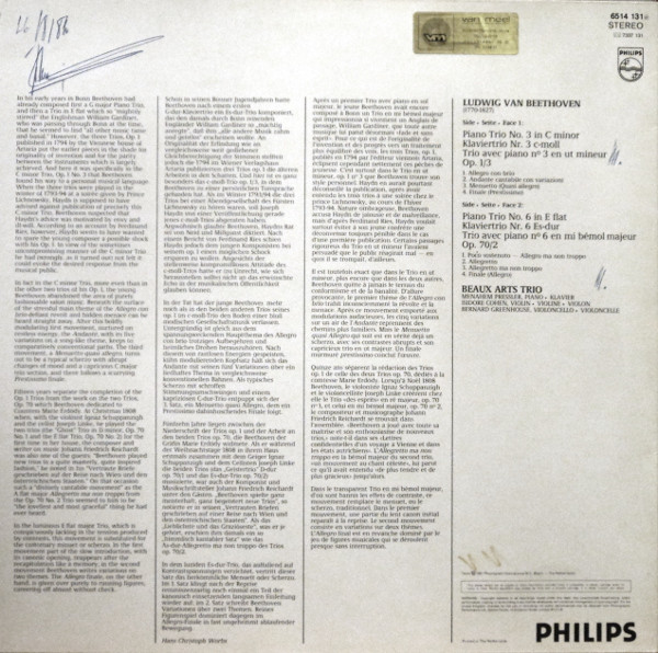 Spine: ■ 6514 131 ■ Beethoven ■ Klaviertrios Op. 1/3 & Op. 70/2 ■ Beaux Arts Trio ■ Philips ■ 6514 131 ■