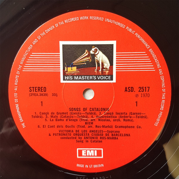 Red labels with His Master’s Voice ‘postage stamp’ logo top. EMI logo bottom.