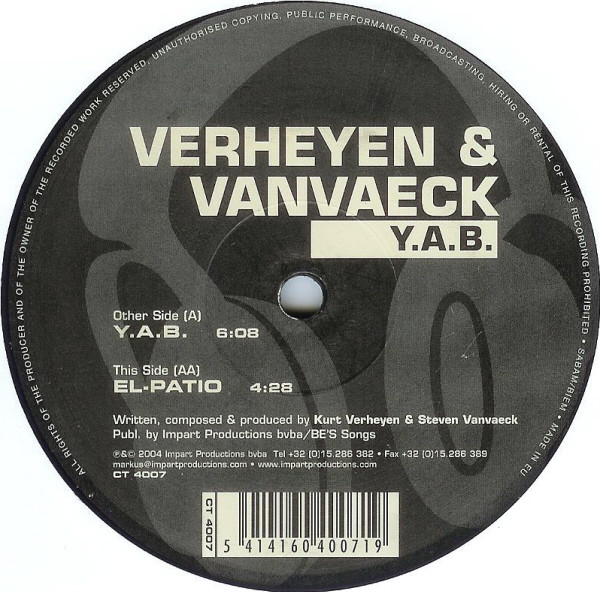 A-side of the vinyl is mastered/cut as a 10″. “VERHEYEN – VANVAECK Y.A.B.” is etched in the outer rim of dead wax.