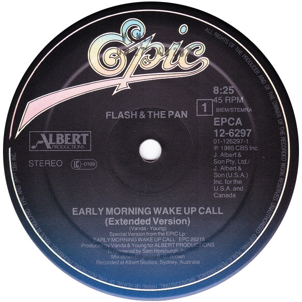 ” Early Morning Wake Up Call (Extended Remixed Version)” appears on front of sleeve; “Early Morning Wake Up Call (Extended Version)” appears on back of sleeve and on label.