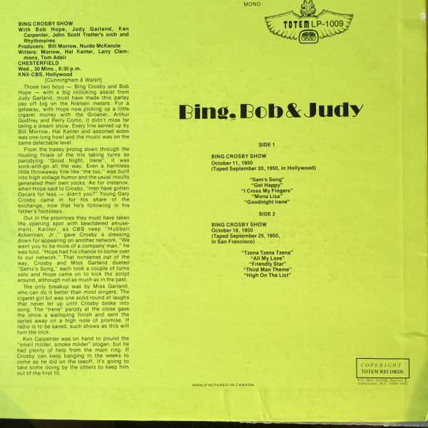 Side A and Side B are complete episodes of the “Bing Crosby Show” for Chesterfield. Each side is one track – I’ve listed the songs sung and who is singing.