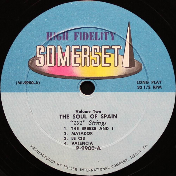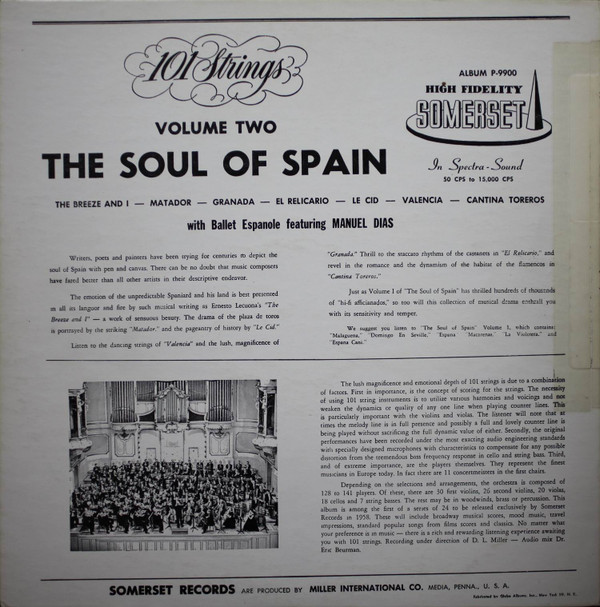 Depending on the selections and arrangements, the orchestra is composed of 128 to 141 players. Of these, there are 30 first violins, 26 second violins, 20 violas, 18 cellos and 7 string basses. The rest may be in woodwinds, brass or percussion. This album is among the first of a series of 24 to be released exclusively by Somerset Records in 1958. These will include broadway musical scores, mood music, travel impressions, standard popular songs from film scores and classics. No matter what your preference is in music – there is a rich and rewarding listening experience awaiting you with 101 strings. Recording under direction of D. L. Miller – Audio mix Dr. Eric Beurman.