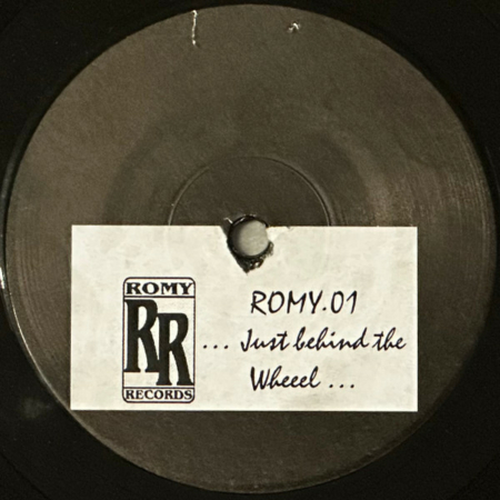 Plain black labels have sticker on music side. Blank side of record is lightly etched with “Just Behind The Wheel” around edge and Romy Records logo.
