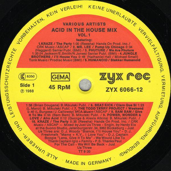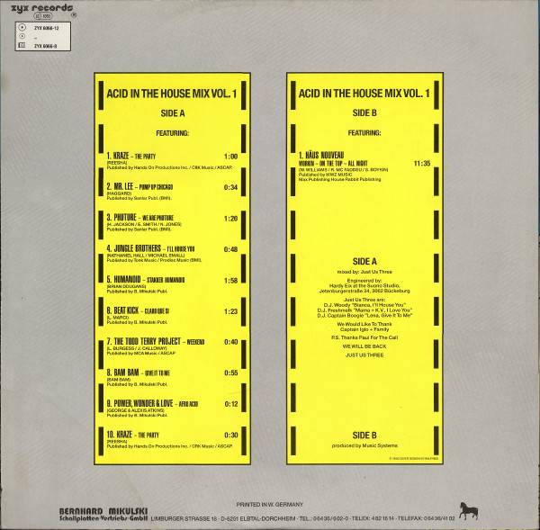 Also on CD [url=http://www.discogs.com/Various-Acid-In-The-House-Mix-Vol-1/release/822498]ZYX 6066-8[/url]